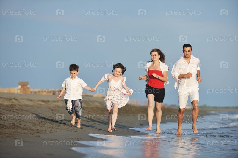 Счастливая молодая семья, бегущая по пляжу