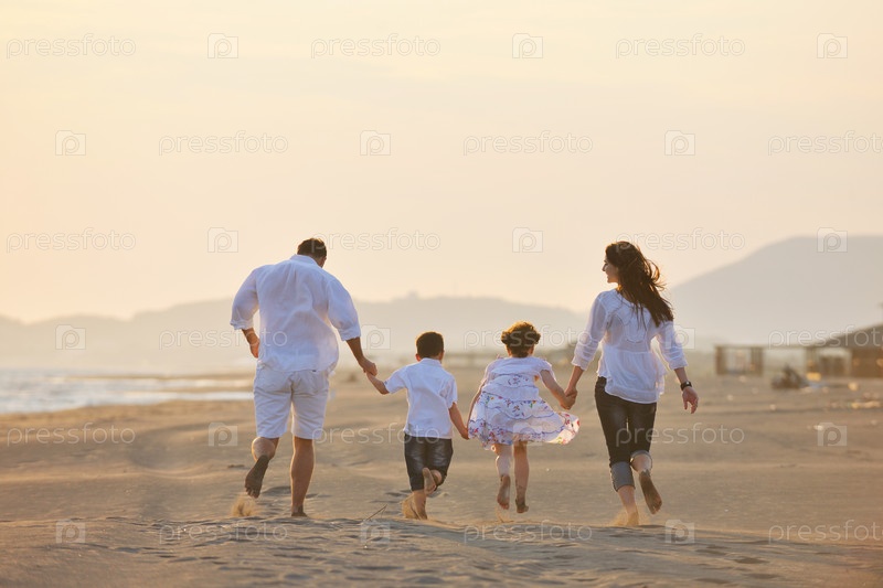 Счастливая молодая семья отдыхает на пляже на закате