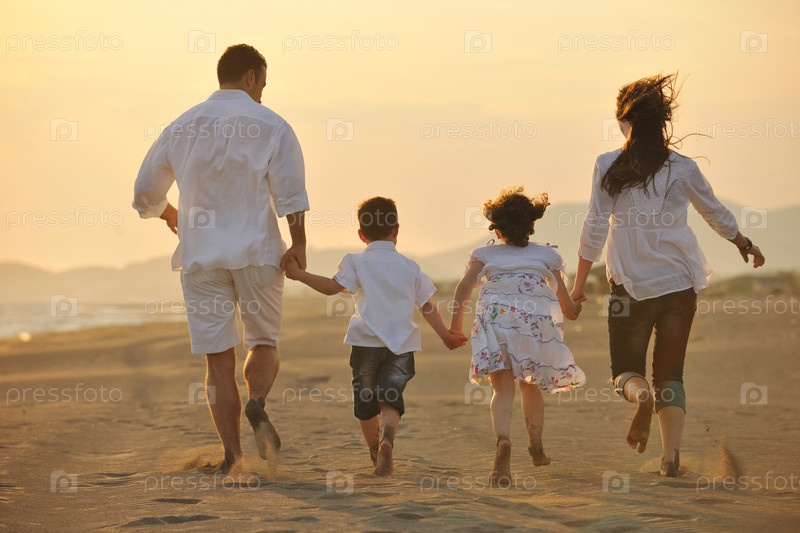 Счастливая молодая семья отдыхает на пляже на закате