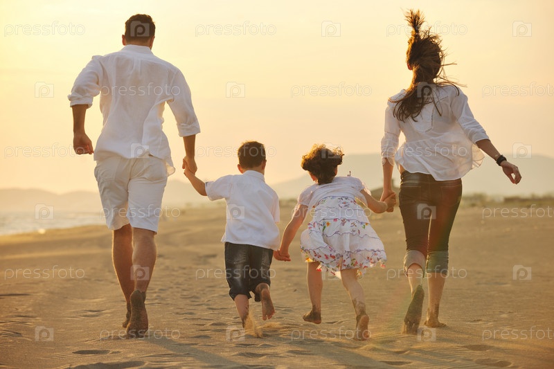 Счастливая молодая семья отдыхает на пляже на закате