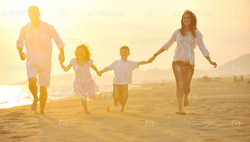 Счастливая молодая семья отдыхает на пляже на закате