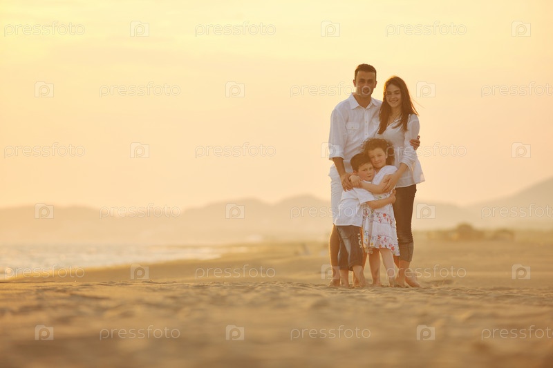Счастливая молодая семья отдыхает на пляже на закате
