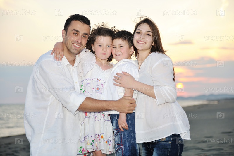 Счастливая семья на морском пляже на закате солнца