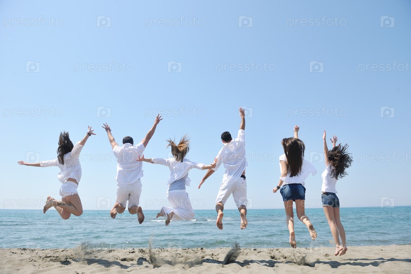 Веселые молодые люди на пляже в солнечный день