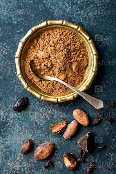 Какао-порошок, бобы и темный шоколад