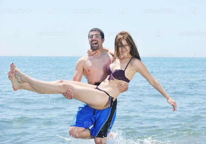 Счастливая молодая пара на берегу моря