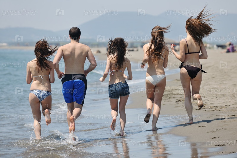 Красивые молодые люди на пляже в солнечный день