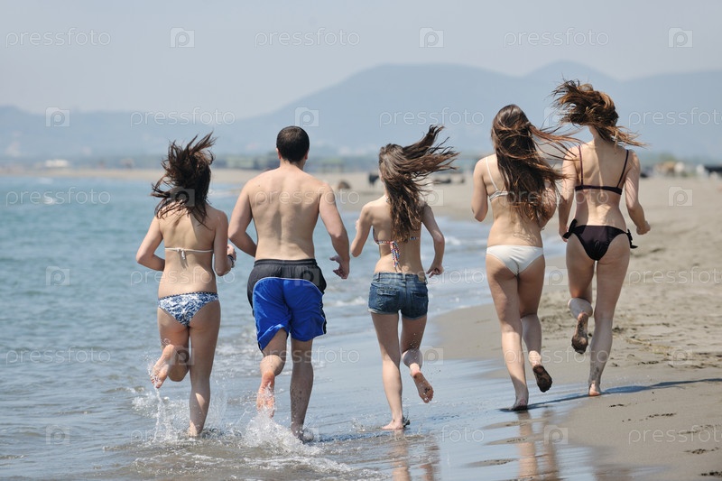 Красивые молодые люди на пляже в солнечный день