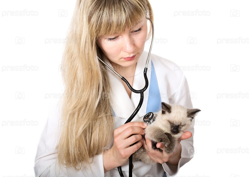 Ветеринар слушает котенка