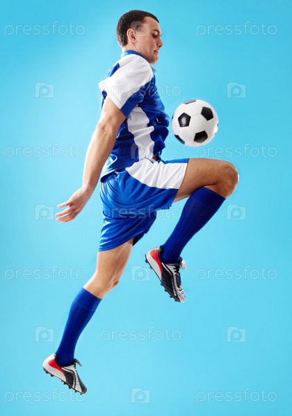 Портрет футболиста, прыгающего с мячом на синем фоне