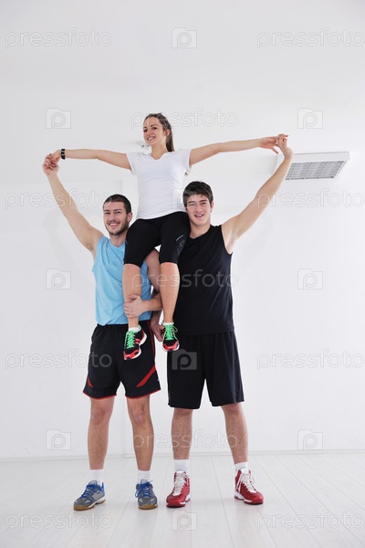 Счастливые молодые люди в фитнес-клубе