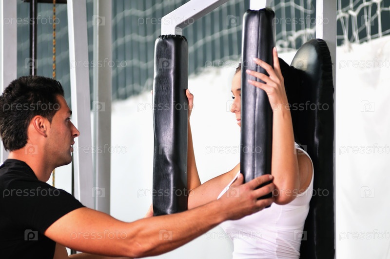 Женщина занимается в фитнес-клубе с личным тренером