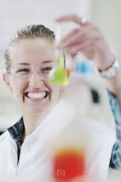 Студентка в белом халате проводит исследование в лаборатории