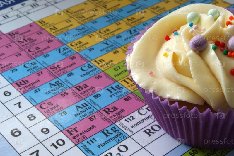 Пирожное на фоне таблицы Менделеева