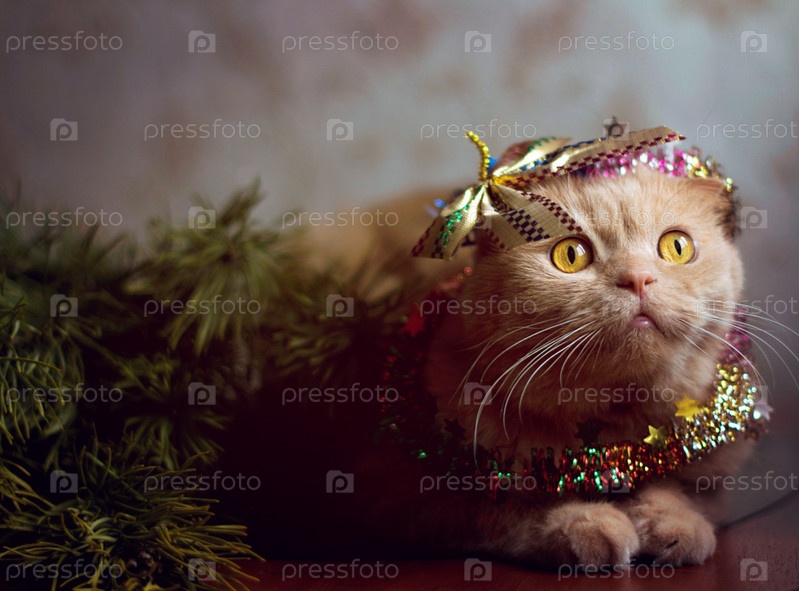 Праздничный домашний кот в мишуре