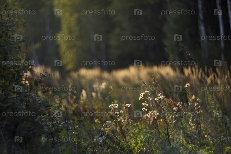 Цветы и растения в солнечном вечернем поле