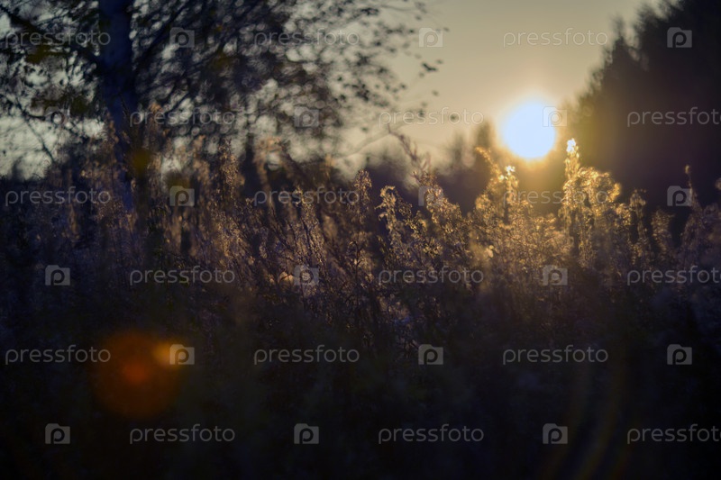 Цветы и растения в солнечном вечернем поле