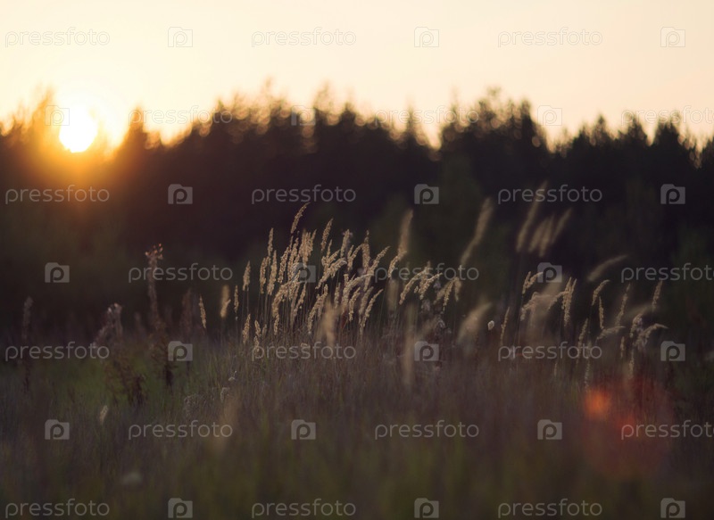 Цветы и растения в солнечном вечернем поле