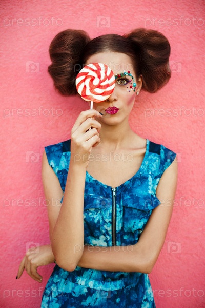 Яркая девушка с конфетой