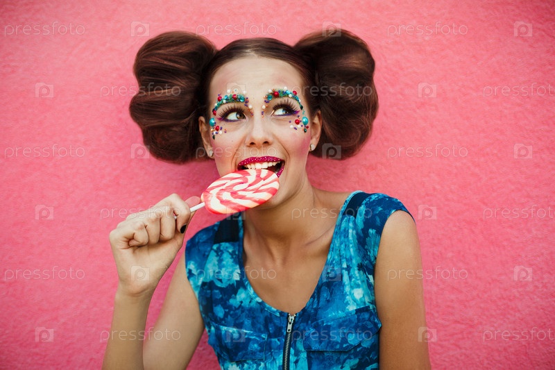 Яркая девушка с конфетой