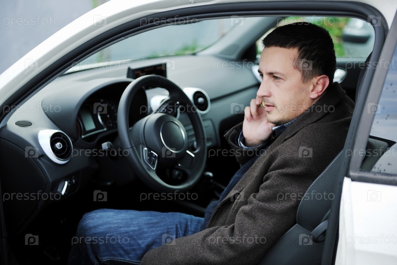 Молодой человек сидит в автомобиле и говорит по телефону