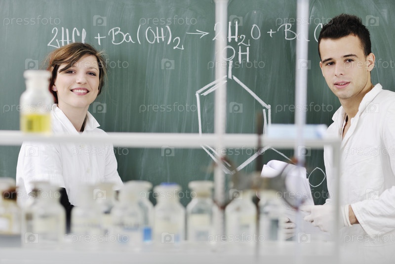 Двое студентов проводят исследование в химической лаборатории