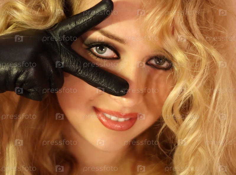 Девушка с длинными светлыми волосами, в черной кожаной перчатке