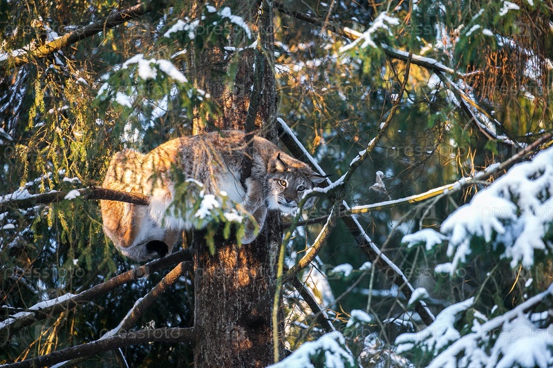 Рысь на ветке дерева в зимнем лесу