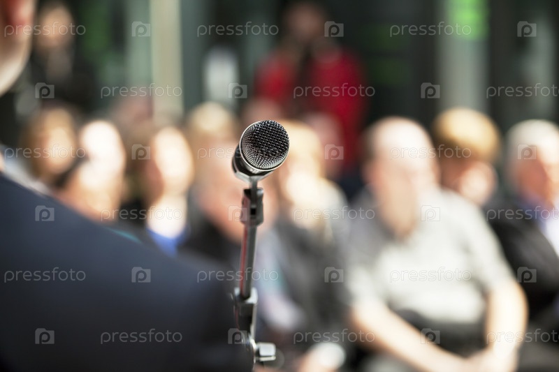 Микрофон в фокусе против размытой аудитории