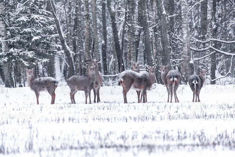 Пятнистые олени в зимнем лесу