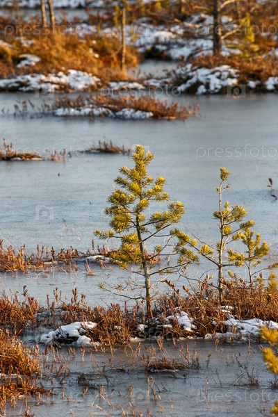 Небольшие сосны на болоте зимой