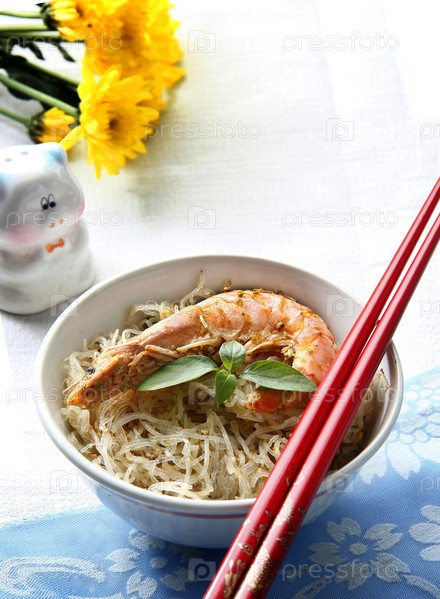 Лапша с большими креветками