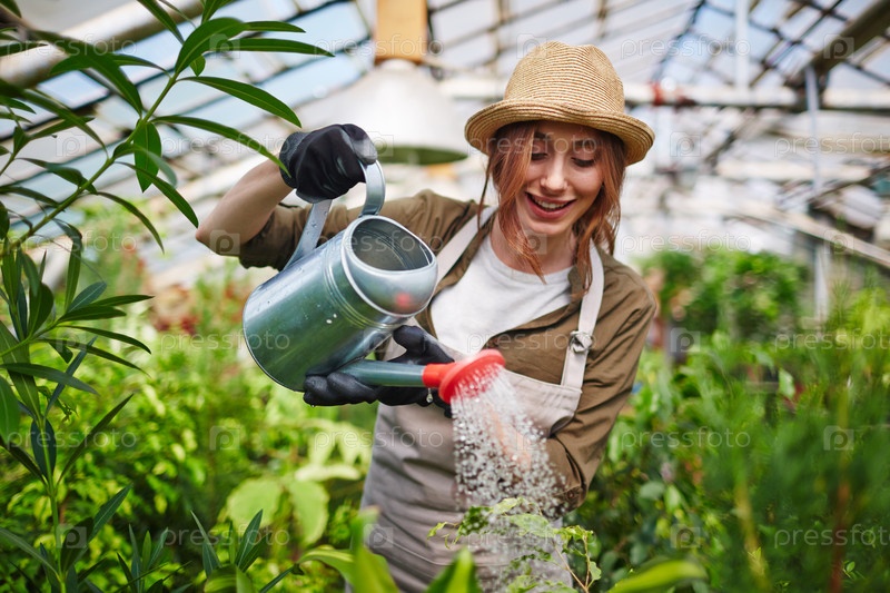 Девушка поливает растения