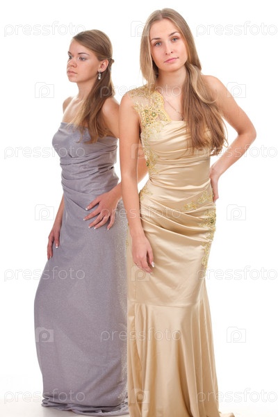 Две красивые молодые женщины в вечерних платьях на белом фоне