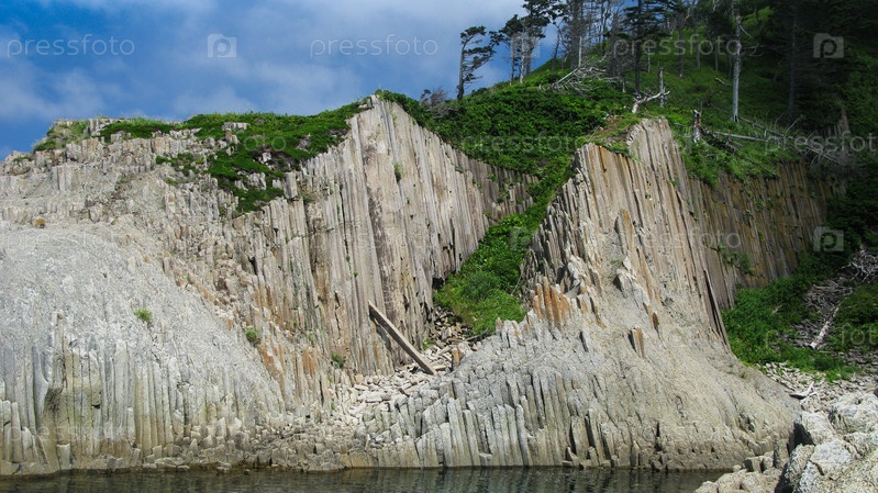 Столбные скалы мыса Столбчатый в Кунашире, Курильские острова, Россия