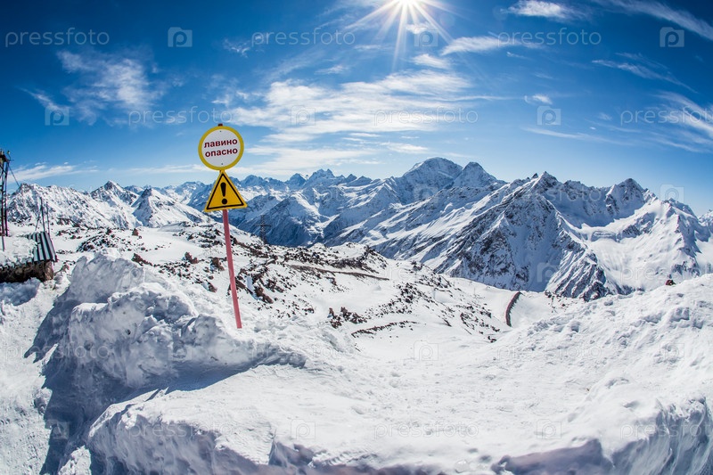 Предупреждающий знак лавинной опасности. Красивый зимний пейзаж с заснеженными горами