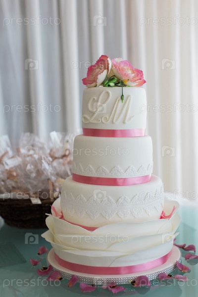 Красивый свадебный торт с розовыми лентами