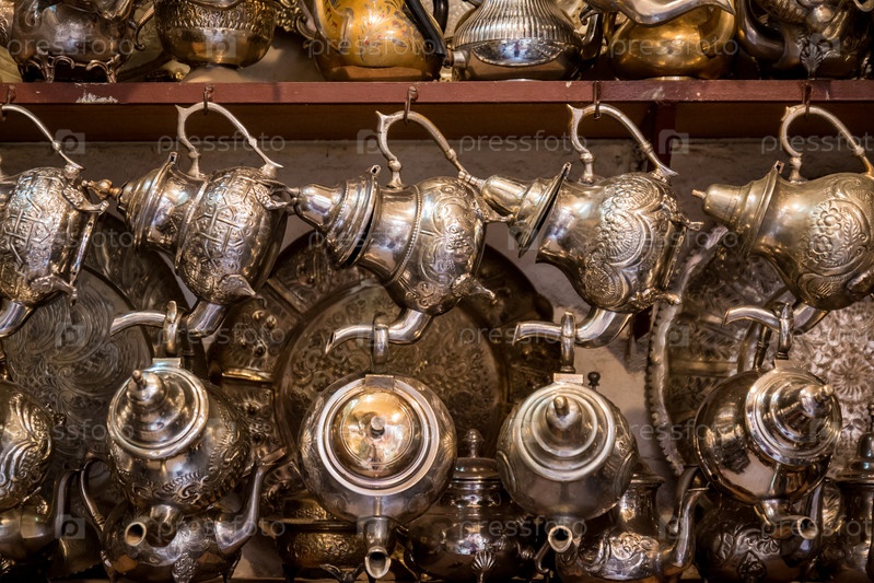 Арабские чайники для чая на восточном базаре