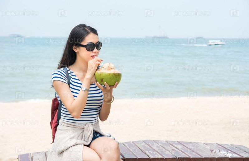 Девушка с кокосом на пляже