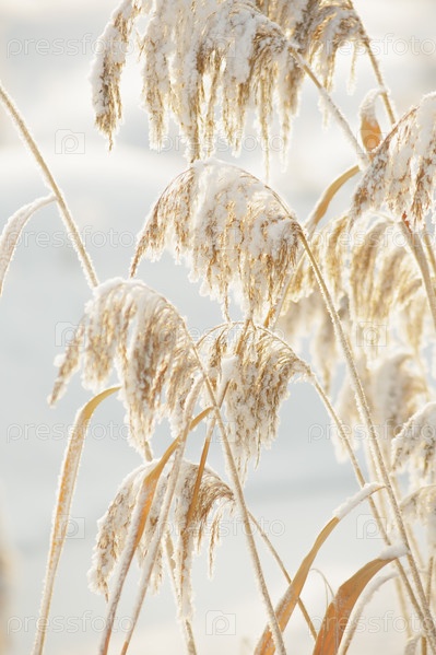Стебли тростника покрыты снегом