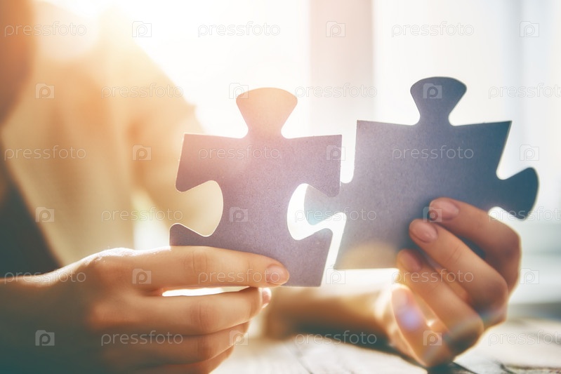 Женщина соединяет пару кусочков головоломки