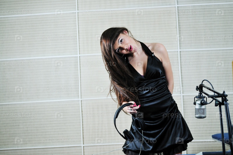 Красивая брюнетка танцует с наушниками в руке