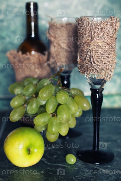 Бутылка вина с зеленым виноградом