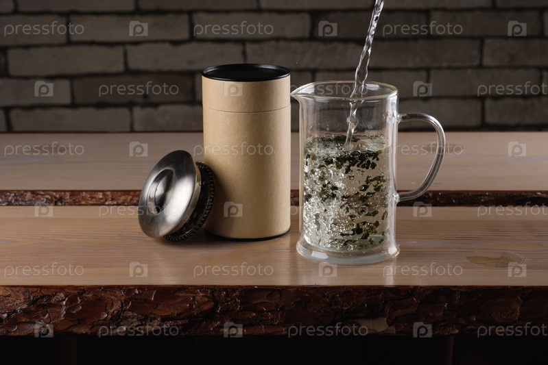 Горячая вода наливается в стеклянный чайник