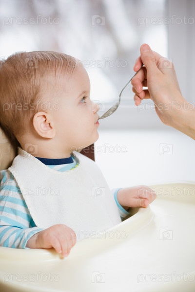 Мать кормит маленького ребенка с ложки