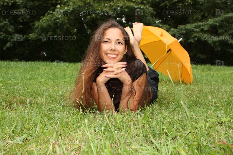 Красивая молодая женщина с зонтом в парке на зеленой траве