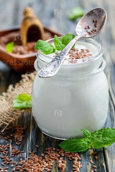 Стеклянная банка с йогуртом и семенами коричневого льна. Диетическое питание
