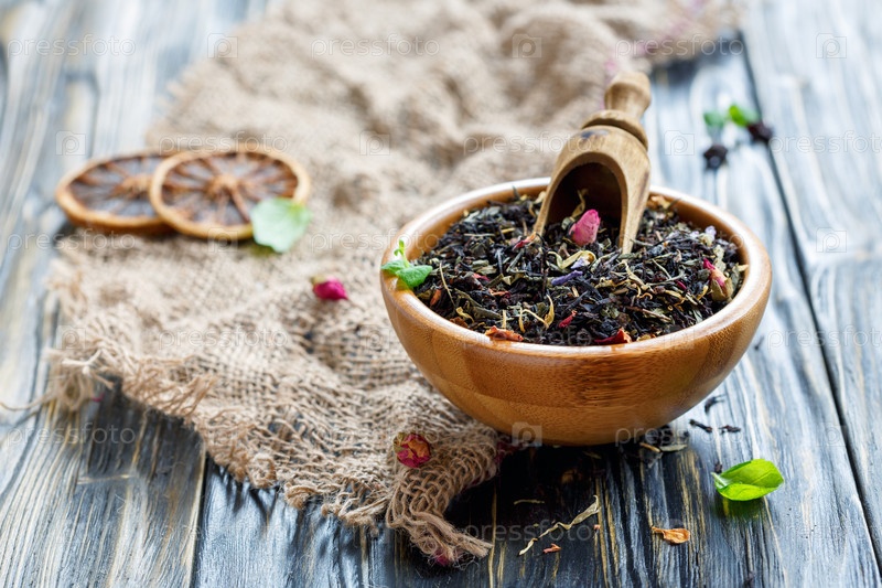 Миска с черным чаем и цветочными лепестками