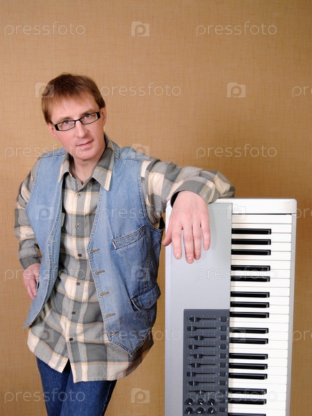Молодой человек стоит рядом с синтезатором