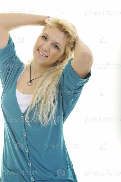 Счастливая девушка, изолировано на белом фоне, студийный портрет